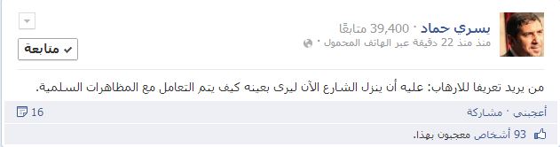 وقال حماد على صفحته الرسمية على موققع التواصل الاجتماعي "الفيس بوك" منذ قليل،"من يريد تعريفا للارهاب، عليه أن ينزل الشارع الآن، ليرى بعينه كيف يتم التعامل مع المظاهرات السلمية".