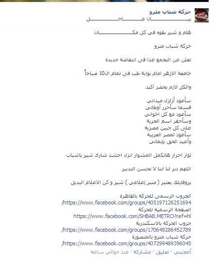وذكرت الصفحة الرسمية للحركة علي موقع "الفيسبوك" في بيان لها:-حركة شباب متروتعلن عن التجمع غدا فى انتفاضة جديدة، بجامعة الازهر أمام بوابة طب فى تمام الـ10 صباحًا.