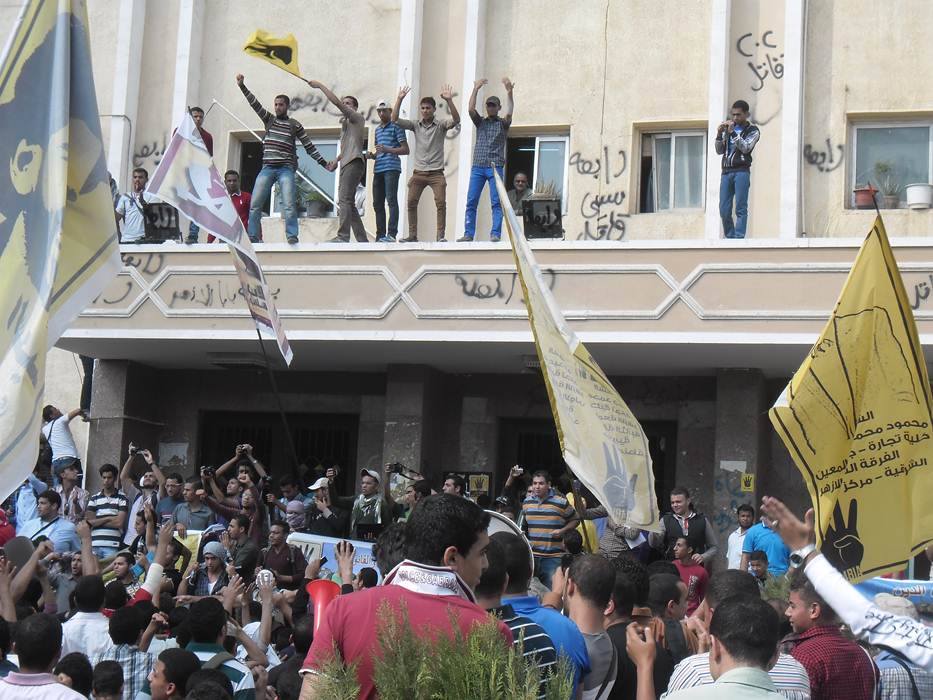 حاصر المئات من طلاب جامعة الأزهر المتظاهرين المبنى الرئيسى لإدارة الجامعة، حيث قاموا بتوزيع المتظاهرين على جميع ابواب الادارة وإغلاقها سواء الباب الرئيسى أو الخلفى أو الابواب الفرعية، كما اعتلى بعض الطلاب المبنى وكتبوا شعارات رابعة عليها، ورددوا هتافات ثورية على أصوات الطبول.