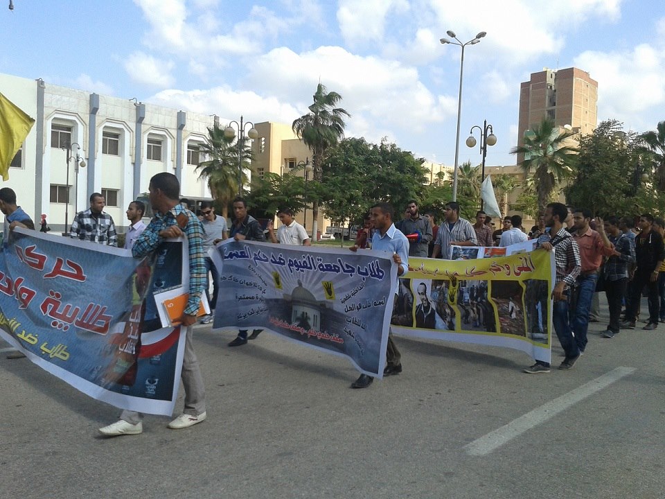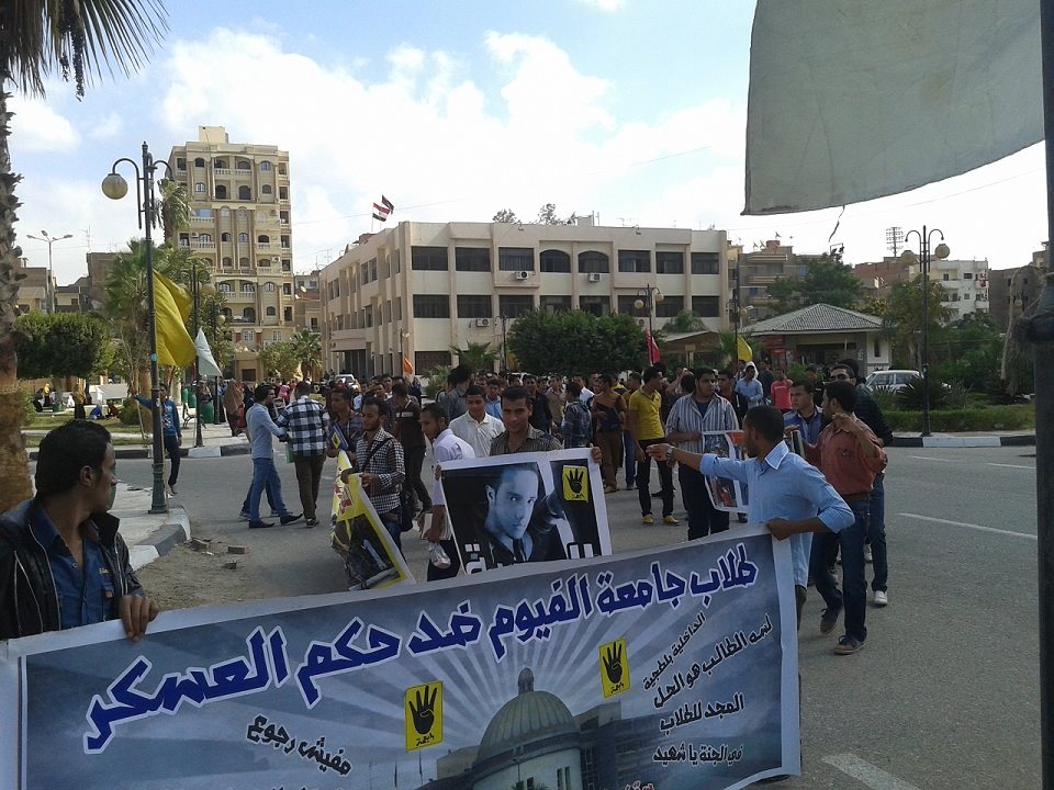 نظم " طلاب ضد الانقلاب " بجامعة الفيوم ، فعاليات طلابية مناهضة لحكم العسكر من سلاسل بشربة امتدت بين كليتي الزراعة والتمريض ، لتتحرك بعدها مسيرة حاشدة الي كلية التربية ومنها الي كليات الجامعة الأخري ، رفضا للحكم العسكري في مصر ، والتنديد بالاعتدائات المستمرة علي المسيرات الطلابية بجامعات مصر وبخاصة جامعة الازهر ، مؤكدين صمودهم وعدم الحيود عن مطالبهم حتي تتحقق جميعها ، ويسقط الانقلاب .