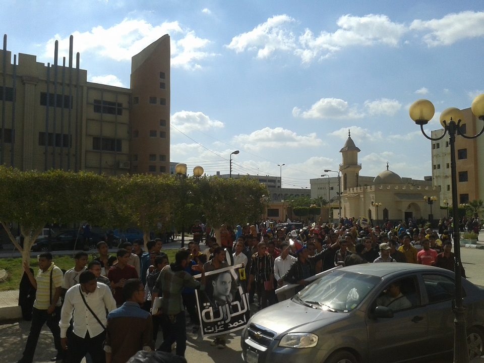 حمل الطلاب صوراً لطالب كلية الهندسة الشهيد " عبد الله أبو بكر " ، وصوراً اخري للطلاب المعتقلين من أبناء الجامعة والذين وصل عددهم ل 6 طلاب ، مطالبين بضرورة الافراج الفوري عنهم ، ومنددين ببطئ الاجرائات التي تتخذها الجامعة في هذا الأمر ، وجابت المسيرة الجامعة رافعين صور رابعة الصمود ومرددين هتافات " ياحرية فينك فينك .. حكم العسكر بينا وبينك " ، " ياسلطات القمع سامعة .. الثورة خارجة من الجامعة " , " إصحــى يــاطالـب انـت وهــي.. وأفهــم دورك فــي الكليــة .. مهمــا تذاكــر مهمــا هتنجــح .. تعبــك رايــح للحــراميــة " ، " لسة الطالب هو الحل .. مهما شاف من العسكر ذل " .