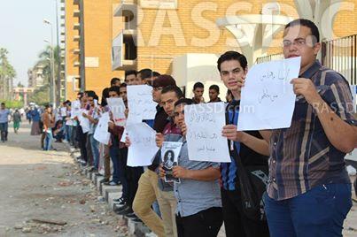 ونظم طلبة الهندسة جامعة المنصورة سلسلة بشرية أمام بوابة الكلية ضمن فعاليات الإضراب عن الدراسة اليوم بسبب إشتباكات الأمس .
