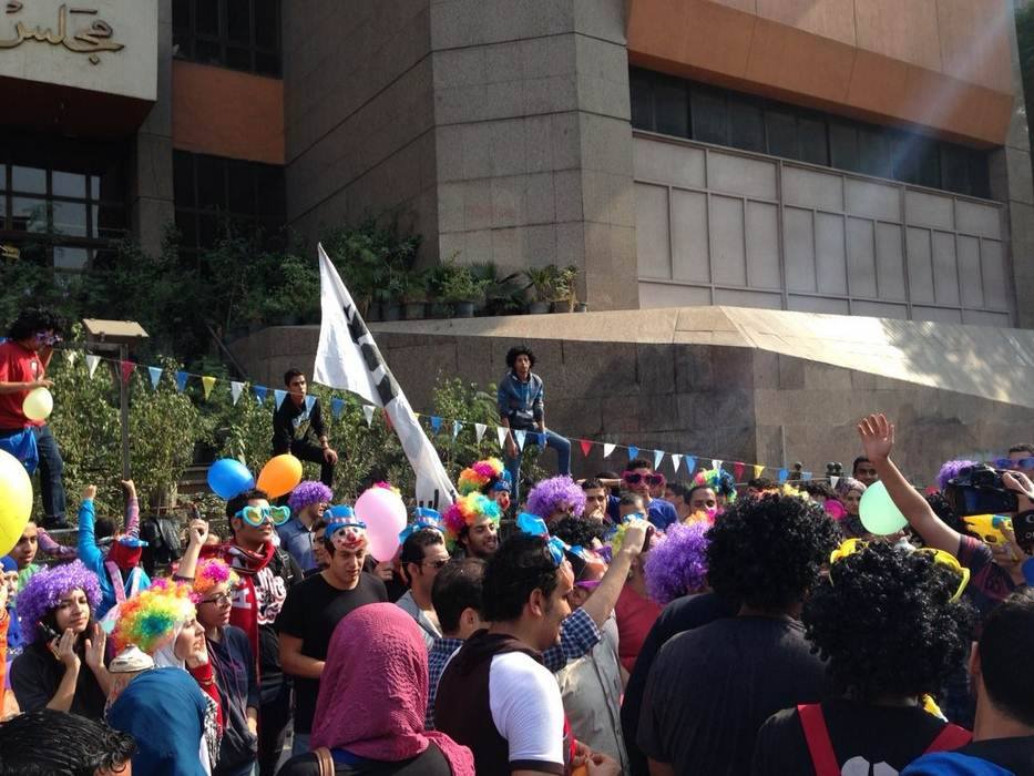 نظم العشرات من أعضاء حركة شباب 6 إبريل وقفة احتجاجية أمام مجلس الدولة ظهر اليوم احتجاجا على البلاغات المقدمه ضدهم باستدراجهم كمنظة ارهابية،مرتدين الماسكات ورافعين البلالين والنظارات الملونة والاكسسوارات التى يرتديها المهرجون، كما قاموا بتعليق الزينة كنوع من الرد الساخر على تلك الدعوات.