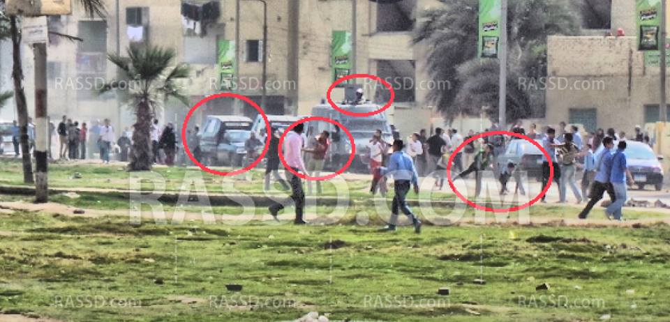 وجاءت مدرعة مكافحة الشغب مدعومة بأربع سيارات شرطة تقل العشرات من العساكر والبلطجية الذين ألقوا قنابل الغاز المسيل للدموع من خارج كلية الهندسة على المسيرة وكذلك قام البلطجية برمي الحجارة عليهم من خارج الجامعة .