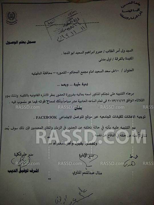 أحالت إدارة كلية الهندسة بجامعة المنصورة احد الطلاب للتحقيق بالجامعة بتهمة توجيه إهانات للقيادات الجامعية عبر موقع التواصل الإجتماعي "الفيسبوك".