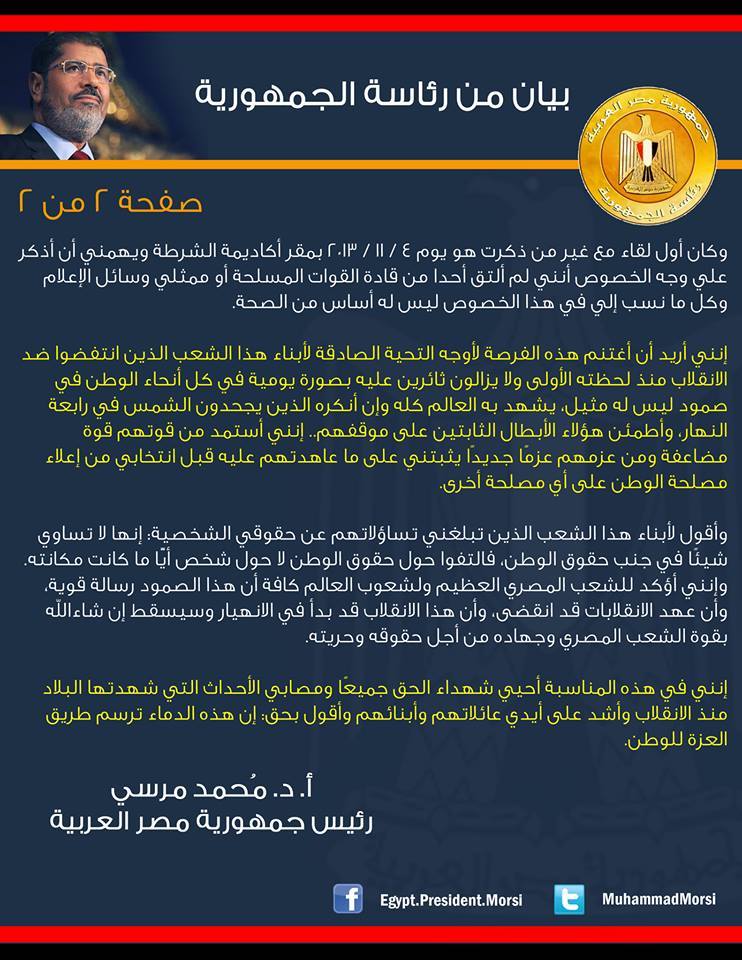 تداول عدد من نشطاء موقع التواصل الاجتماعي "الفيس بوك " أمس (الأربعاء) تصميم لبيان الرئيس محمد مرسي والذي تلاه الدماطي بعد زيارته للرئيس في مقر احتجازه