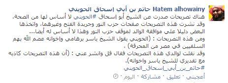 وأضاف:"ومن هذه التصريحات : (الحويني يقول الشيخ ياسر برهامي وإخوانه عصم الله بهم السلفيين في مصر من المحرقة) ، وقد نقلت لوالدي هذه التصريحات فقال قل وانشر عني : (أن هذه التصريحات كاذبة مع تقديري للشيخ ياسر واخوانه)."