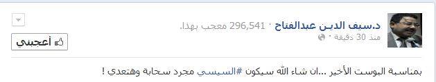 وكتب د. سيف عبد الفتح يقول : "بمناسبة البوست الأخير …إن شاء الله سيكون السيسي مجرد سحابة وهتعدي ".