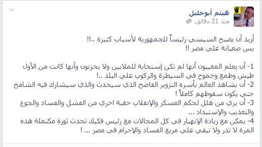 واختتم:- "يمكن مع زيادة الإنهيار في كل المجالات مع رئيس فكيك تحدث ثورة مكتملة هذه المرة لا تذر ولا تبقي علي مربع الفساد والإجرام في مصر".