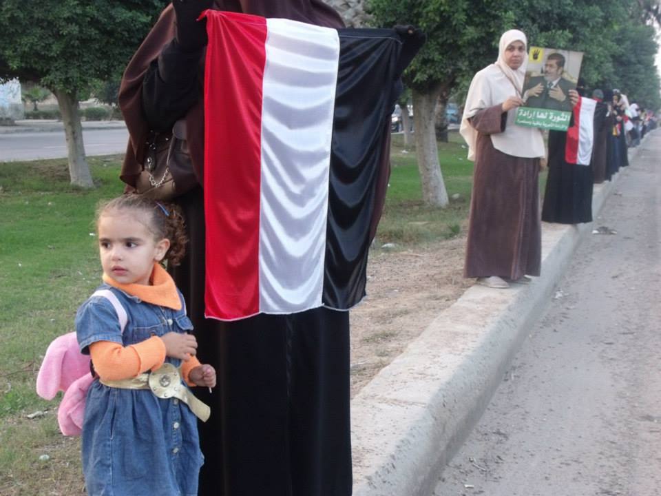 و رفع المشاركون في السلسلة صور الرئيس محمد مرسي وشعارات رابعة، ولافتات أخرى كتب على بعضها "الشعب يحاكم الانقلاب ".