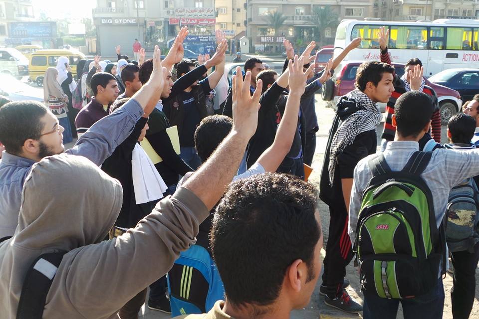نظم عدد من طلاب جامعة 6أكتوبر وقفة صباحية لطلاب امام الباب الرئيسي للجامعة تنديدا باحداث الازهر أمس.