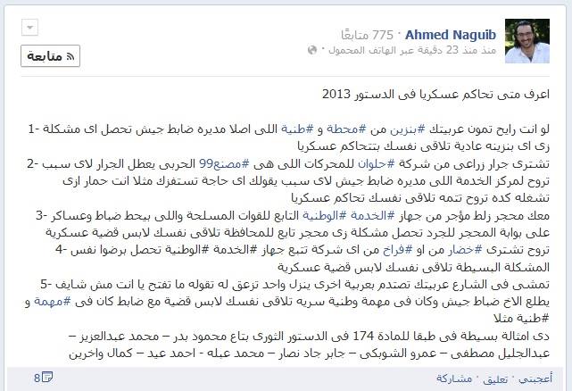 أحمد نجيب:متى يحاكم المصري عسكريا في دستور 2013؟