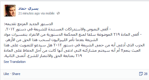 وتابع: "الحزب الذي أدعى أنه من حمى الشريعة في دستور ٢٠١٢ هل سيدعو للتصويت على هذا العبث بنعم!! أم أنه سيختم مشاركته التي ادعى أنها كانت من أجل الحفاظ على المادة ٢١٩ بمتابعة الحق والانتصار للشرع. أتمنى الثانية".