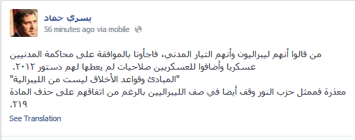 "وأضاف في تدوينه له على صفحته الشخصية علي موقع "الفيسبوك" اليوم (الجمعة):-والمبادئ وقواعد الأخلاق ليست من الليبرالية"معذرة فممثل حزب النور وقف أيضا في صف الليبراليين بالرغم من اتفاقهم على حذف المادة ٢١٩.