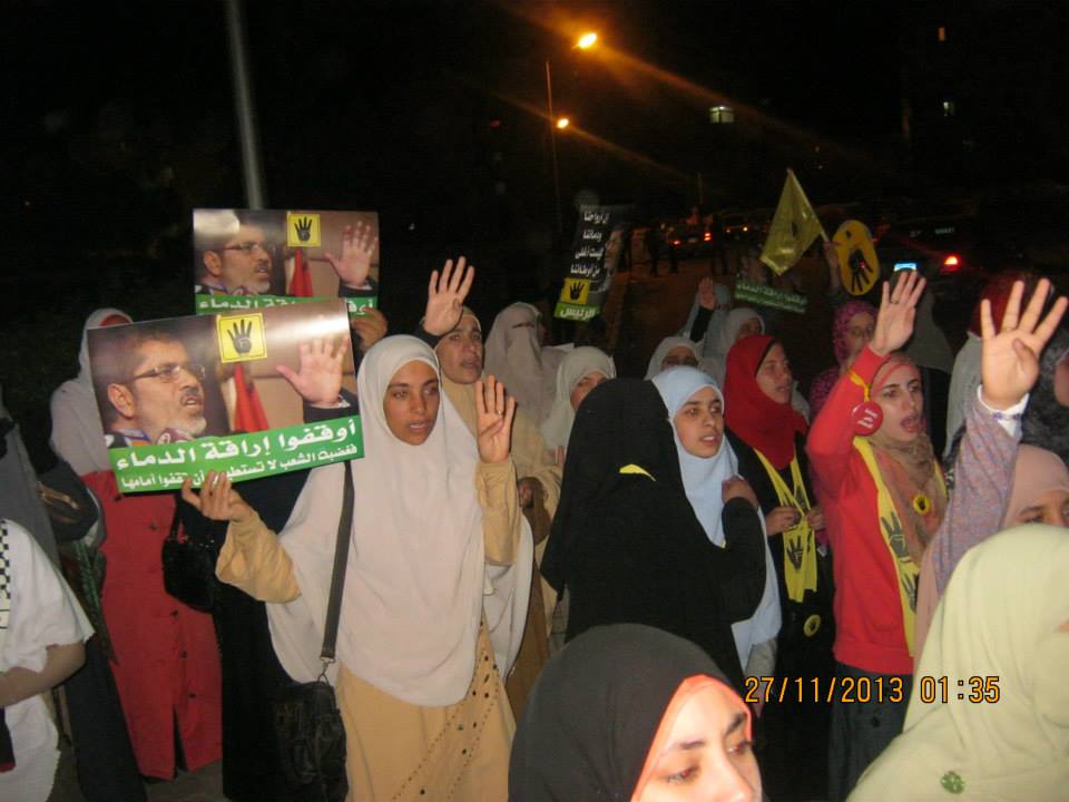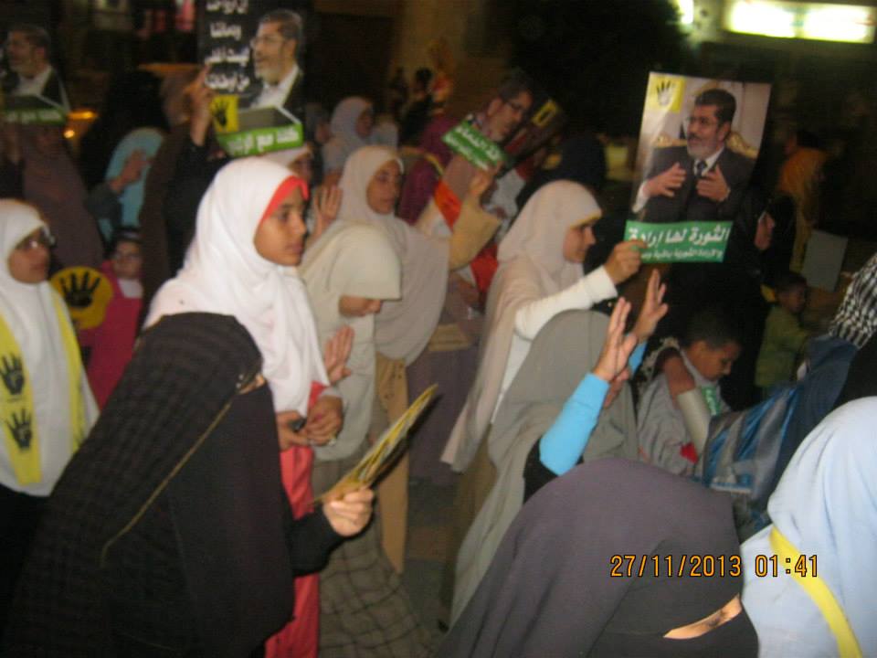 وأكد المتظاهرون استمرارهم في التظاهر رغم ما أسموه إرهاب الانقلاب، ورفعوا لافتات رابعة وصور الرئيس محمد مرسي، ورددوا هتافات " الانقلاب هو الارهاب – يسقط حكم العسكر – مكملين ومش خايفين".