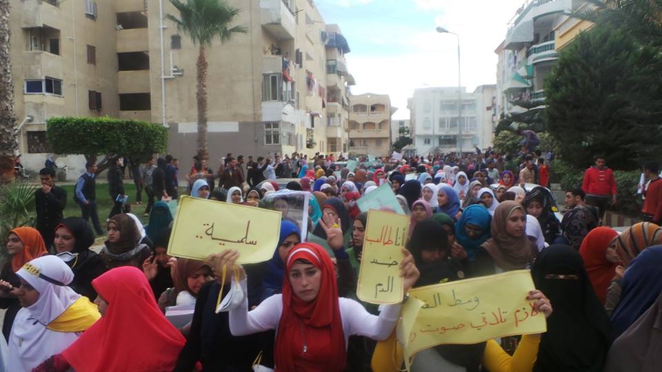 شهدت شوارع دمياط الجديدة اليوم الأحد تظاهرات آلاف الطلاب من جميع كليات جامعة دمياط وجامعة الأزهر بالمدينة والمعاهد الخاصة, حيث انطلقت التظاهرة الطلابية من امام كلية تجارة بجامعة دمياط وانضمت لها تظاهرة اخرى من طب اﻻزهر وتوجهت المسيرة الى شارع الصعيدى. الذى فضت فيه الداخلية تظاهرات الجمعه الماضية .