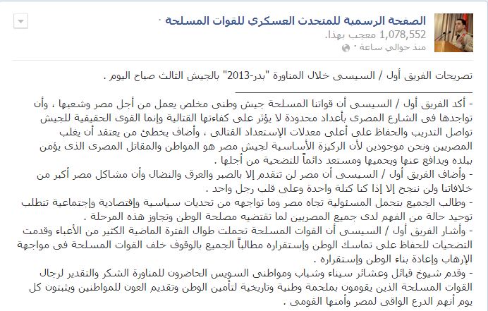 أكد الفريق أول عبدالفتاح السيسى – قائد الانقلاب العسكري في 3 يوليو الماضي – أن "القوات المسلحة جيش وطنى مخلص يعمل من أجل مصر وشعبها ، وأن تواجدها فى الشارع المصرى بأعداد محدودة لا يؤثر على كفاءتها القتالية وإنما القوى الحقيقية للجيش تواصل التدريب والحفاظ على أعلى معدلات الإستعداد القتالى "