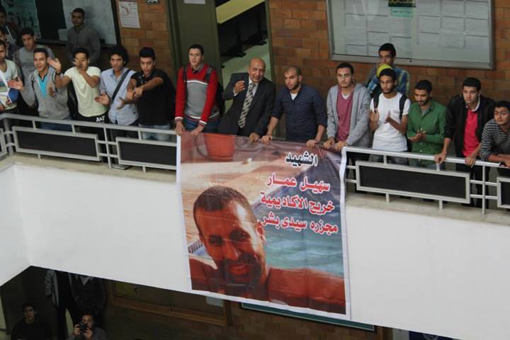 نظم طلاب الأكاديميه العربيه للعلوم والتكنولوجيا والنقل البحرى بالاسكندرية فاعليه بعنوان " عبده فين " للتعريف بشهداء الأكاديمية " أحمد عبده وسهيل عمار والزناتى والمنياوى " داخل مقر كليه الهندسه