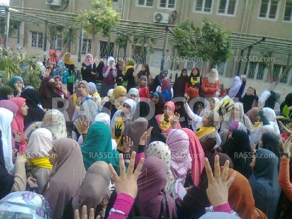 وقد هتف المتظاهرون بسقوط الحكم العسكري وطالبوا قادة الانقلاب بعودة الشرعية المتمثلة في الرئيس والدستور ومجلس الشوري وطالبوا أيضا بإطلاق سراح زملائهم المعتقلين والقصاص للشهداء، كمارفعوا شارات رابعة العدوية وصور للرئيس محمد مرسى، فيما لوحظ تواجد أمني مكثف بمحيط الجامعة