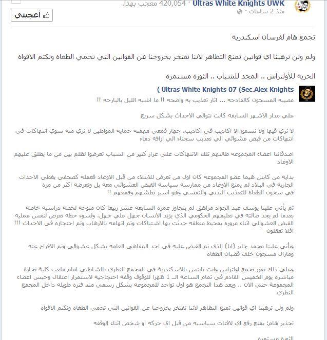 دعت مجموعة أولتراس "وايت نايتس" إلى مظاهرة حاشدة غدا الساعة الواحدة أمام المجمع النظري بالشاطبي بالاسكندرية لتحدي قانون التظاهر والتنديد بالقبض العشوائي على ثلاثة من أعضائها، كما أعلنت أنها لن تقدم إخطار للداخلية لأنها لا تعترف بالقوانين المستبدة.