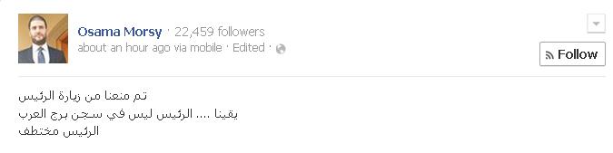 و أضاف عبر حسابه الشخصي على موقع التواصل الإجتماعي "فيس بوك": "تم منعنا من زيارة الرئيس يقينا …. الرئيس ليس في سجن برج العرب الرئيس مختطف ".