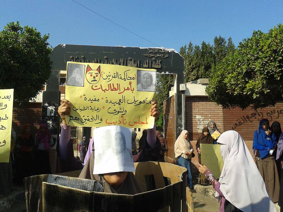 أقامت طالبات كلية الدراسات الاسلامية التابعة لجامعة الازهر فرع بنى سويف محاكمة رمزية لعميدة الكلية د . مفيدة على ابراهيم بسبب فصلها ل 9 طالبات بالكلية عن الدراسة.