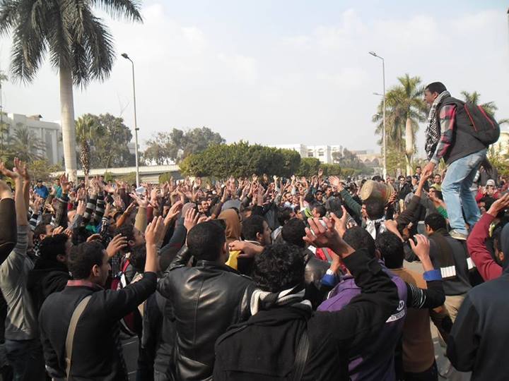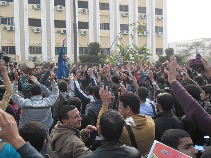 وردد الطلاب هتافات وأغانى ثورية تطالب بالقصاص للشهداء والإفراج عن المعتقلين، وهتافات مناهضة لداخلية الانقلاب والفريق السيسي قائد الانقلاب ، كما رفعوا لافتات مكتوب عليها"حكايتنا احنا طلاب ضد المجلس العسكرى" ولافتات أخرى تندد بحكم العسكر.
