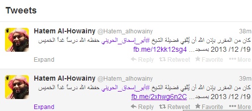 وقال حاتم الحويني على صفحته الرسمية: " كان من المقرر بإذن الله أن يُلْقِي فضيلة الشيخ أبو إسحاق الحويني حفظه الله درساً غداً الخميس 19/ 12/ 2013 بمسجد الصِدِّيق بمدينة المنصورة علي النيل، لكن تم منع المحاضرة.".