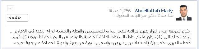 قال الدكتور عبدالفتاح ماضي – أستاذ العلوم السياسية المساعد بجامعة الاسكندرية – أن هذه الأحكام سريعة على الثوار بتهم جزافية بينما البراءة للمفسدين والقتلة والحماية لزراع الفتنة في الاعلام