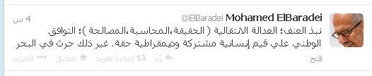 وقال البرادعى بحسب حسابة الرسمي:" نبذ العنف؛ العدالة الانتقالية ( الحقيقة،المحاسبة،المصالحة )؛ التوافق الوطني علي قيم إنسانية مشتركة وديمقراطية حقة. غير ذلك حرث في البحر".