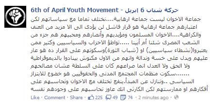 قالت حركة شباب 6 إبريل فى تعليقها على بإعلان حكومة الانقلاب مساء أمس أن جامعة الإخوان المسلمين " إرهابية "  "أن جماعة الإخوان ليست جماعة ارهابية نختلف تماما مع سياساتهم لكن اعتبارهم جماعة إرهابية هو قرار فاشل لن يؤدى إلى إلا مزيد من العنف والكراهية .