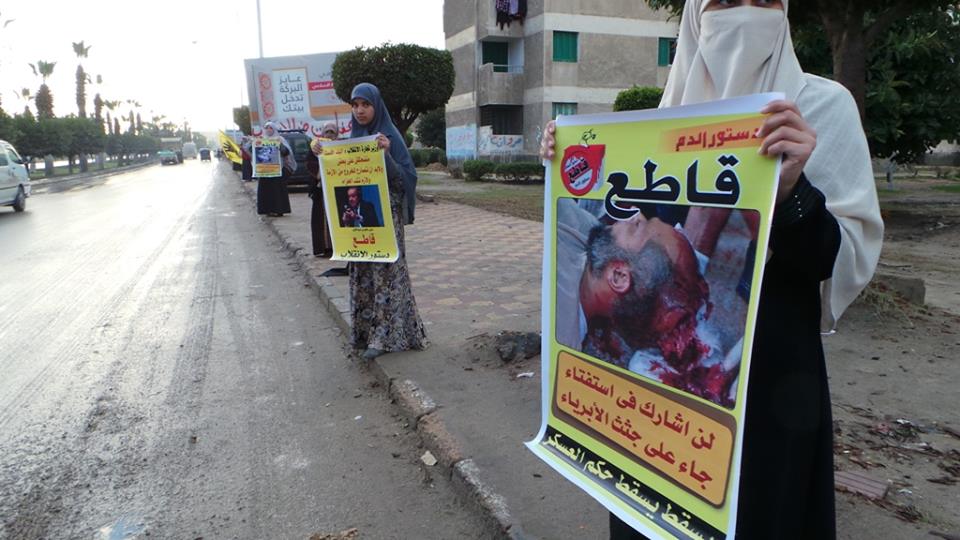 ورفع المشاركون في السلسلة البشرية شارات رابعة العدوية، و صور الرئيس محمد مرسي، ولافتات تناشد الشعب بمقاطعة الإستفتاء على الدستور.