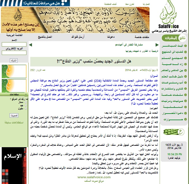 وختم كلامه قائلا:"وهل كان إقرار العلماء لأبي العباس السفاح -مثلاً- بالخلافة وإمرة المؤمنين بعد قتل مئات الألوف تعطيلاً لحدود الله؟!فالتصويت بـ"نعم" للدستور ليس فيه تعطيل لحدود الله -كما زعمتَ!-".