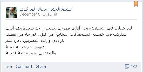 قال الدكتور جمال المراكبي الداعية المعروف أنه" لن يشارك في الإستفتاء ولن يدلي بصوته لسبب واحد بسيط وهو أنني شاركت في خمسة استحقاقات انتخابية من قبل "