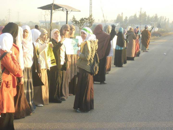 نظم التحالف الوطني لدعم الشرعيه وحركة 7 الصبح سلاسل بشرية علي طريق قرية العايد بلبيس وطريق الزقازيق بمحافظة الشرقية تنديدا بمحاكمة الرئيس الشرعى محمد مرسي ،رافعين شعارات رابعة العدوية،ولافتات مناهضه لحكم العسكر .