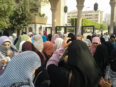 تظاهر عدد من طالبات جامعة الأزهر بالقاهرة،صباح اليوم،أمام المدينة الجامعية بمدينة نصر،إعتراضا علي محاكمة الرئيس محمد مرسي،بأكاديمة الشرطة بالتجمع الخامس .