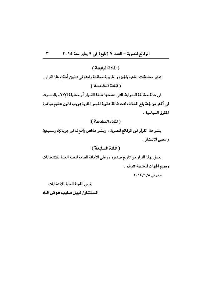 أصدرت اللجنة العليا للإنتخابات قرار رقم 2 لسنة 2014 من 7 بنود بالجريدة الرسمية"الوقائع المصرية" اليوم الخميس بعض المواد لإبداء الرأى فى الإستفتاء على مشروع دستور الإنقلاب المزمع عقده فى 14 و15 يناير الجارى.