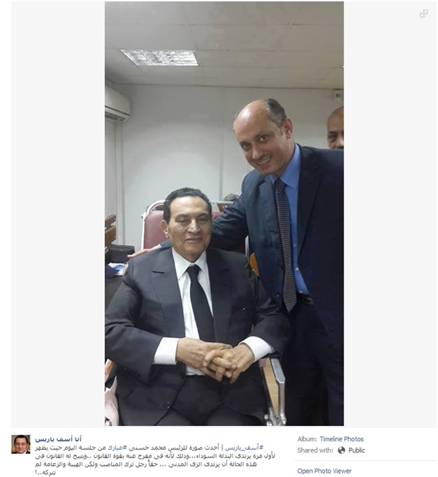 وقالت الصفحة:" أحدث صورة للرئيس محمد حسنى مبارك من جلسة اليوم حيث يظهر لأول مرة يرتدى البدلة السوداء…وذلك لأنه فى مفرج عنه بقوة القانون ..ويتيح له القانون فى هذه الحالة أن يرتدى الزى المدنى … حقاً رجل ترك المناصب ولكن الهيبة والزعامة لم تتركه..!".