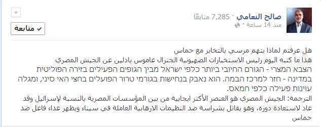 ونقل الدكتور «صالح النعامي» – الصحفي والباحث بالشأن الصهيوني – تصريحات «عاموس»التي وصفها بالخطيرة حيث قال:"هل عرفتم لماذا يتهم مرسي بالتخابر مع حماس، هذا ما كتبه اليوم رئيس الاستخبارات الصهيونية الجنرال عاموس يادلين عن الجيش المصري"-في إشارة لتصريحات رئيس الاستخبارات الصهيونية حول الجيش المصري.