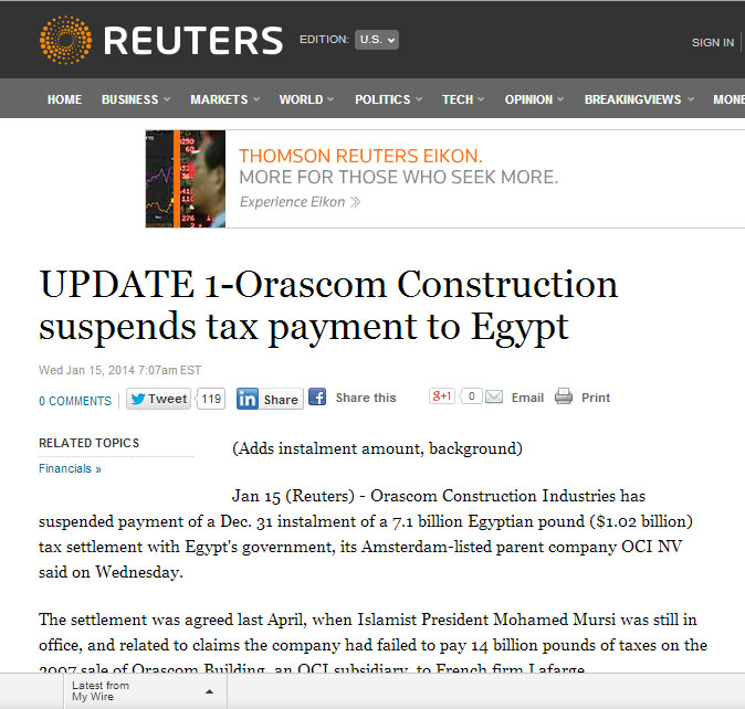 أكد وكالة رويترز الدولية في تقرير اقتصادي ان المهندس نجيب ساويريس توقف عن دفع الضرائب التي فرضتها عليه حكومة الرئيس مرسي قبل أحداث 30 يونيو والتي كانت تبلغ 7.1 مليار جنيه ضرائب متأخرة.