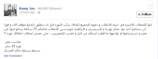 كما طالب القوى الثورة – جميعها- بالتوحد وباللحاق بركب الثورة قبل انطلاقها، وقال عبر موقع التواصل الاجتماعي – فيس بوك – : "إنها اللحظات الأخيرة في حياة الانقلاب … نحن نعيش لحظات انطلاق ثورة"