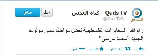 نقلت قناة القدس الفضائية عبر صفحتها الرسمية على موقع التواصل الاجتماعي "توتير" أن المخابرات الفلسطينية برام الله في الضفة الغربية اعتقلت مواطنًا سمّى مولوده الجديد "محمد مرسي" .