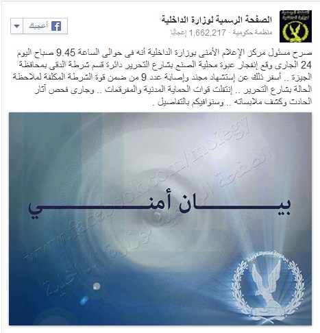 وذكر بيان لداخلية الانقلاب عبر الصفحة الرسمية للوزارة على موقع التواصل الاجتماعى "فيس بوك " أن الحادث "أسفر عن استشهاد مجند وإصابة عدد 9 من ضمن قوة الشرطة المكلفة لملاحظة الحالة بشارع التحرير، وانتقلت قوات الحماية المدنية والمفرقعات، وجاري فحص آثار الحادث وكشف ملابساته".