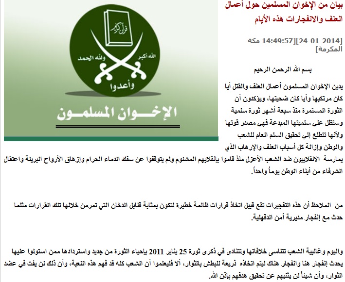وأضاف البيان الذى صدر على الموقع الرسمي للجماعة – "إخوان أون لاين" – "من الملاحظ أن هذه التفجيرات تقع قبيل اتخاذ قرارات ظالمة خطيرة؛ لتكون بمثابة قنابل الدخان التي تمر من خلالها تلك القرارات، مثلما حدث مع إنفجار مديرية أمن الدقهلية".