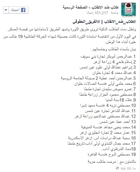 أعلن طلاب ضد الانقلاب بيانا بأسماء 19 طالب ارتقوا اليوم شهداء فى الذكرى الثالثة لصورة 25 يناير.