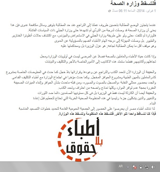 وقالت حركة "أطباء بلا حقوق"، في بيان لها بعنوان "فلتسقط وزارة الصحة": "عندما يتجاوز الوضع المطالبة بتحسين ظروف عملنا، إلى التراجع عند حد المطالبة بتوفير وسائل مكافحة عدوى، فإن هذا يعنى أن وزارة الصحة قد وصلت لدرجة من التردّي لم تشهدها حتى وزارة الجبلي ذات السياسات الفاشلة".