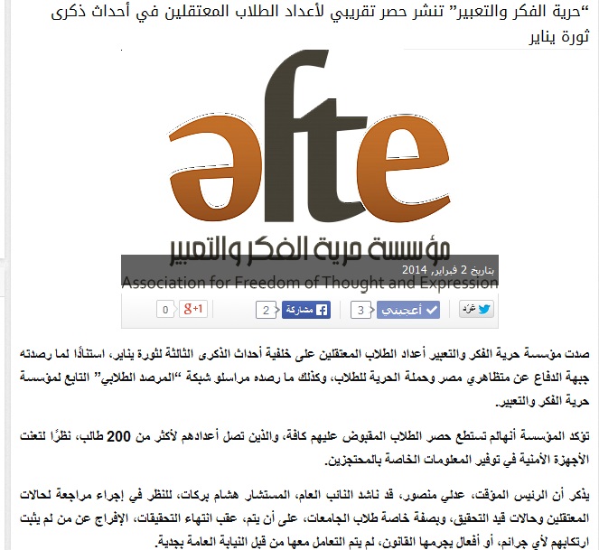 وأوضحت مؤسسة حرية الفكر والتعبير، أنها رصدت أعداد الطلاب المعتقلين على خلفية أحداث الذكرى الثالثة لثورة يناير، استنادًا لما رصدته جبهة الدفاع عن متظاهري مصر وحملة الحرية للطلاب، وكذلك ما رصده مراسلو شبكة "المرصد الطلابي" التابع لمؤسسة حرية الفكر والتعبير.