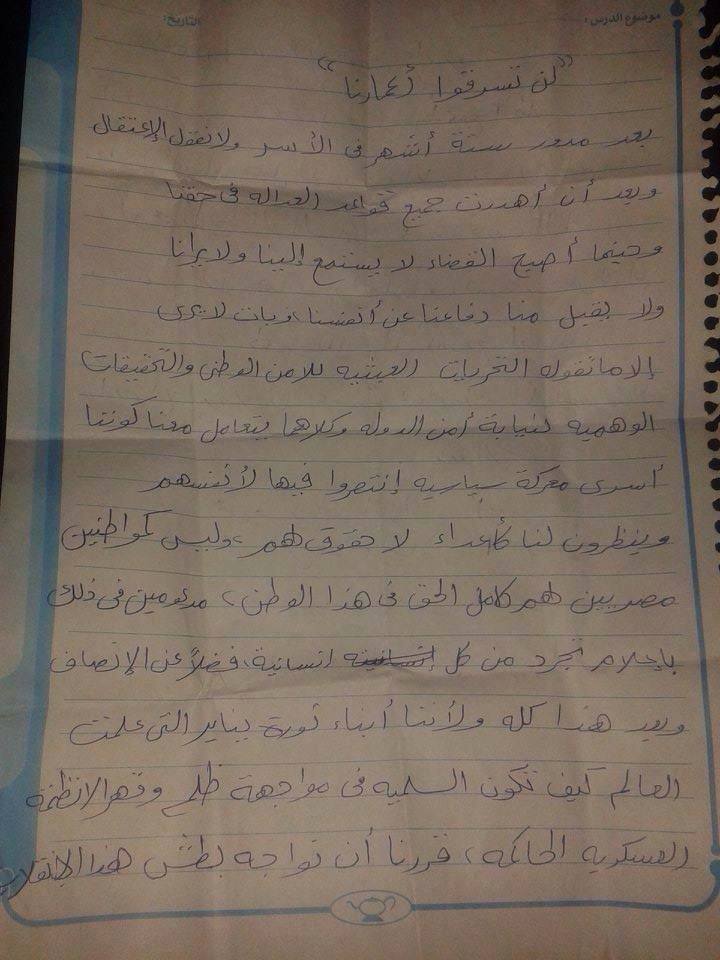 ووجه المعتقلون رسالة من داخل السجن بعنوان "لن تسرقوا أعمارنا" جاء فيها " بعد أن أهدرت جميع قواعد العدالة في حقنا ، وحينما أصبح القضاء لا يستمع إلينا ولا يرانا ولا يقبل منا دفاعنا عن أنفسنا وبات لايرى إلا ما تقوله التحريات "العبثية" للأمن الوطني والتحقيقات الوهمية لنيابة أمن الدولة وكلاهما يتعامل معنا كوننا أسرى معركة سياسية إنتصروا فيها لأنفسهم وينظرون لنا كأعداء لا حقوق لهم ، وليس كمواطنين مصريين لهم كامل الحق في هذا الوطن، مدعومين في ذلك بإعلام مجرد من كل إنسانية فضلا عن الإنصاف .