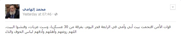 داهمت قوات أمن الانقلاب منزل الكاتب والباحث في التاريخ الإسلامي محمد إلهامي فجر اليوم، كما فتشت المنزل بحثا عنه لاعتقاله.