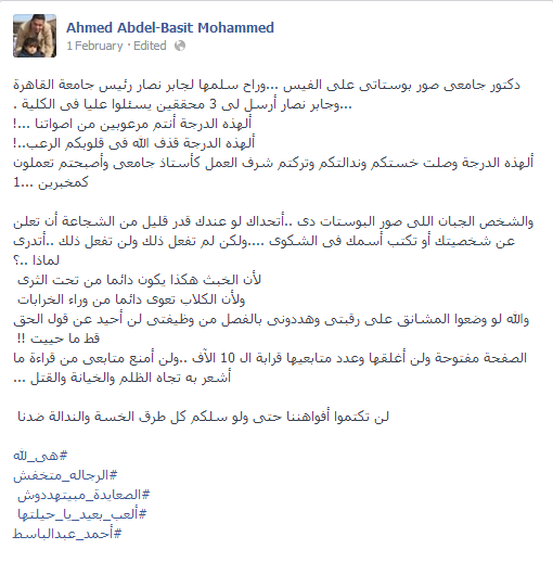 وذكر عبد الباسط عبر حسابه الرسمي على موقع التواصل الاجتماعي – فيس بوك – أن زميلا له صور كتاباته على موقع فيس بوك، وسلمها للدكتور جابر نصار رئيس الجامعة، والذي بدروه أرسل 3 من المحققين ليسألوا عنه في الكلية.